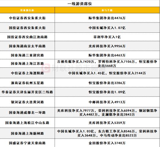 一线游资活跃度一般,中国长城获三家一线亿;恒宝股份遭华泰证券天津东丽开发区二纬路营业部净卖出1.09亿;菲利华遭国投证券西安曲江池南路营业部净卖出1亿。
